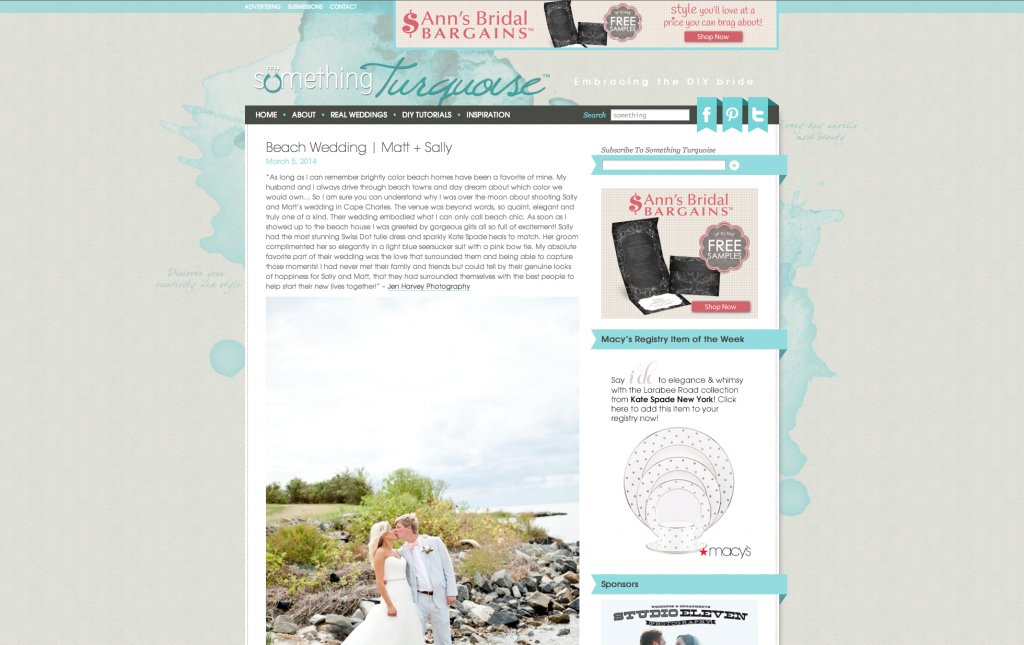 This is a little late but last wednesday Sally + Matt were featured on Something Turquoise, an amazing DIY wedding blog! I was thrilled to have them featured as ST is one of my favorite wedding blogs.