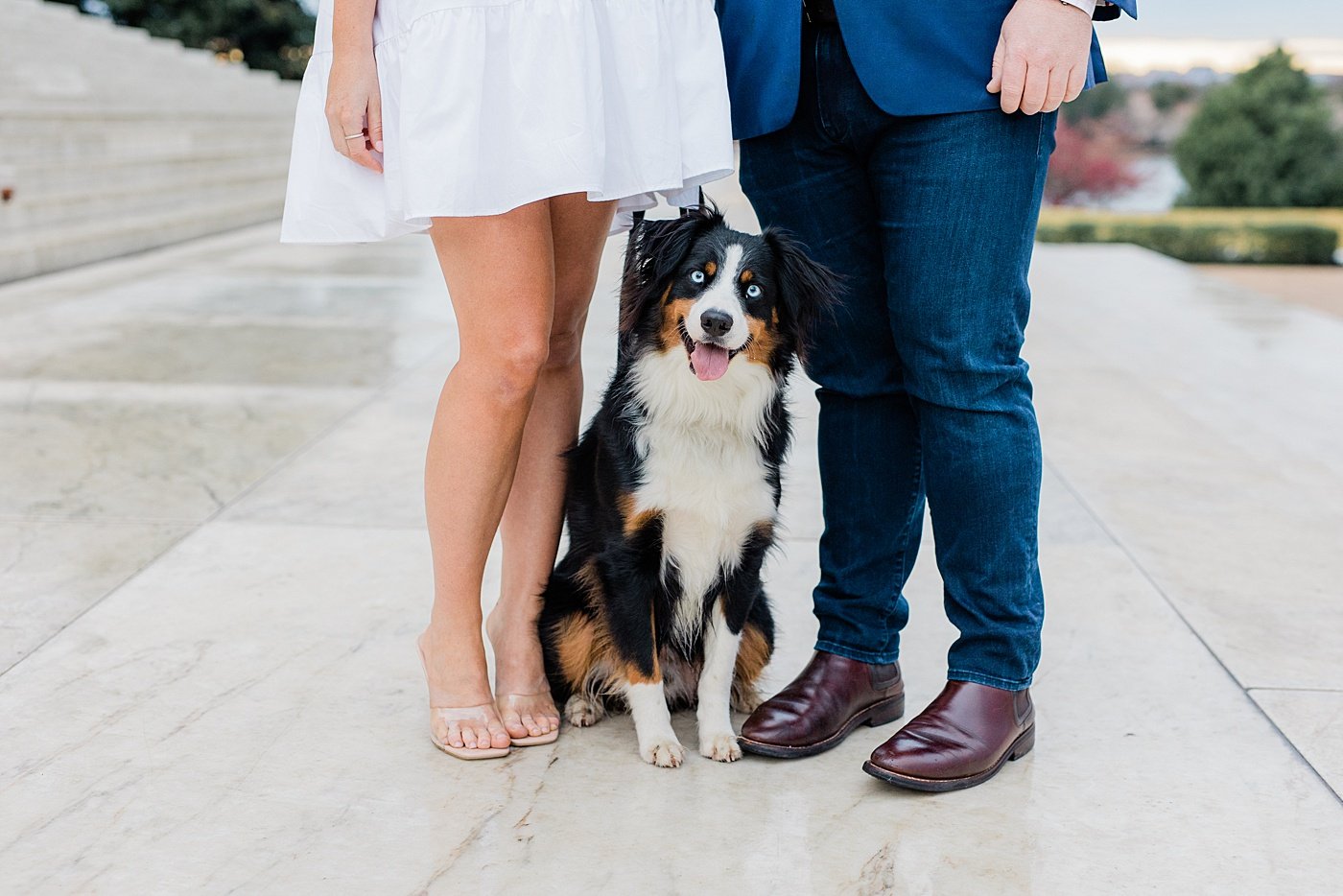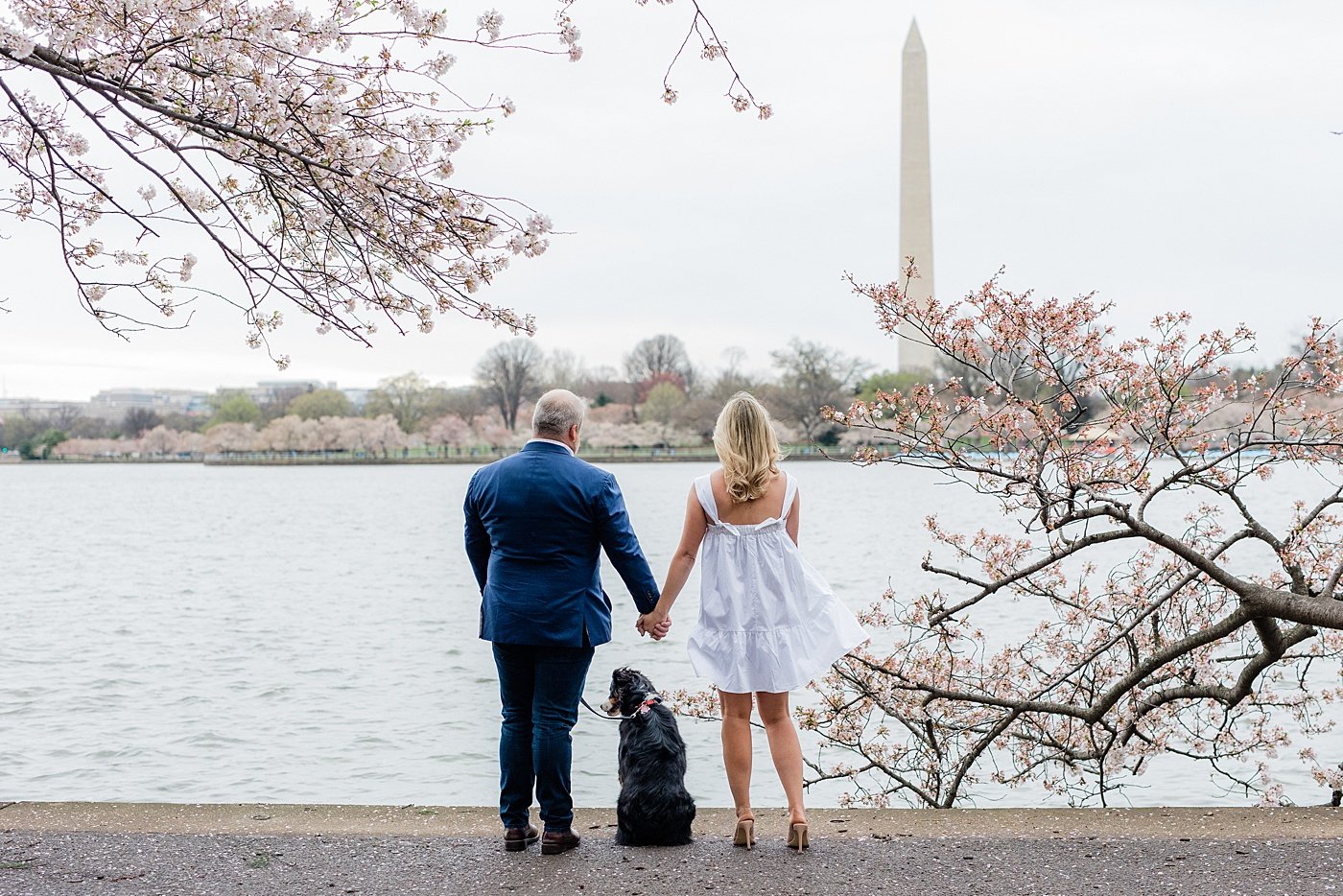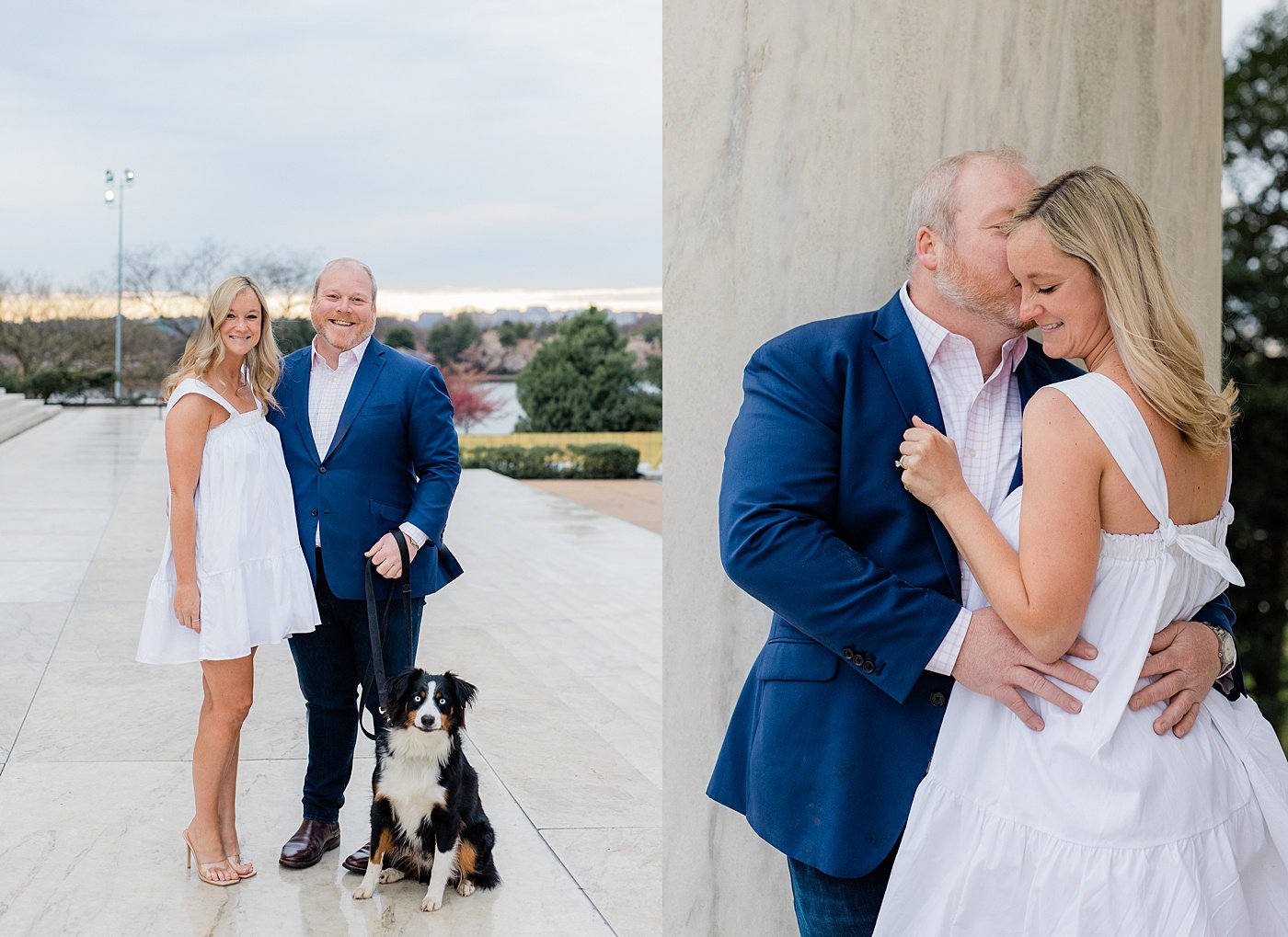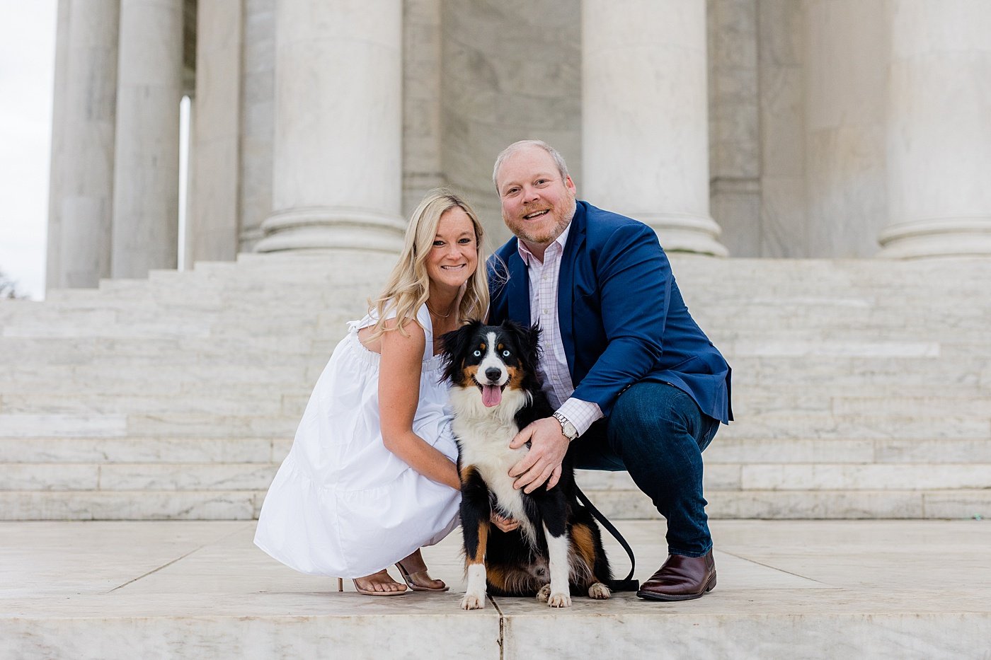 couple and their dog in front of the Jefferson memorial